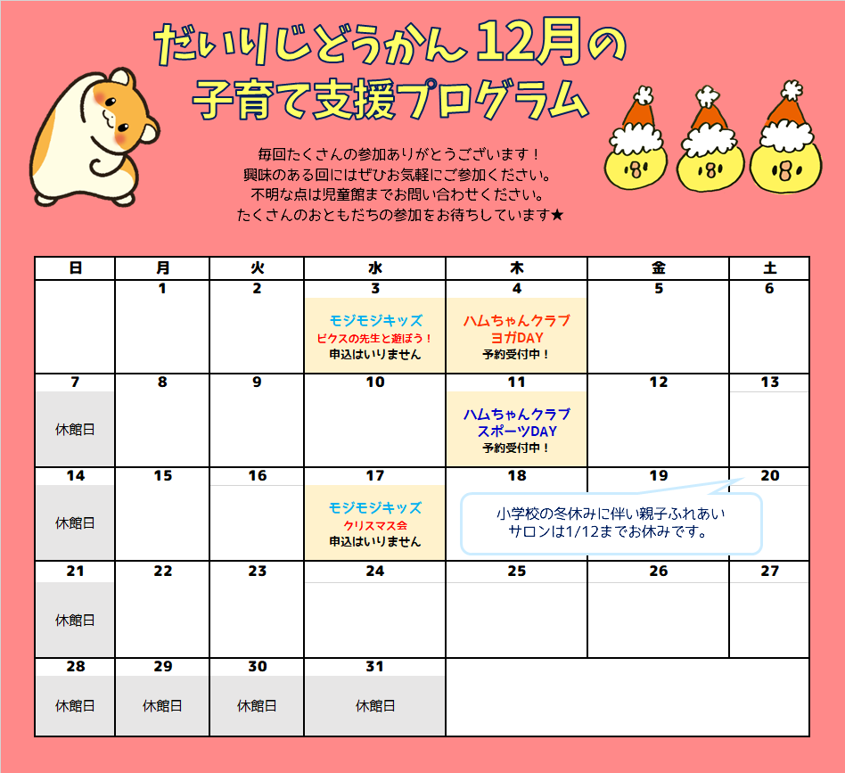 だいりじどうかん 12月の子育て支援プログラムカレンダー