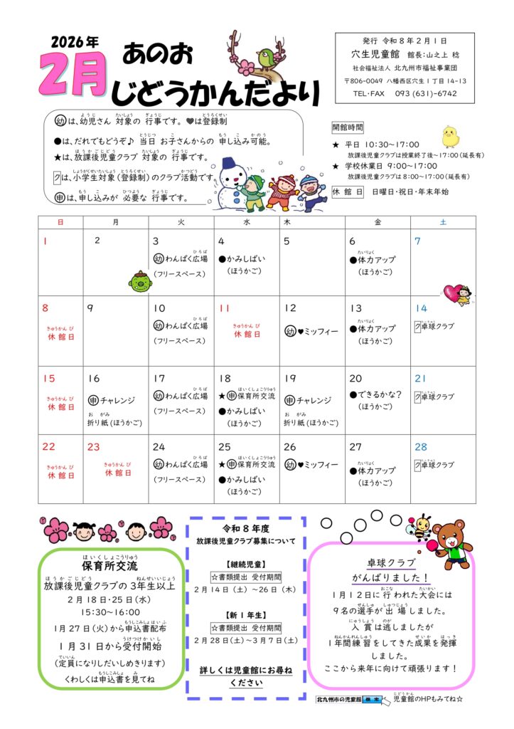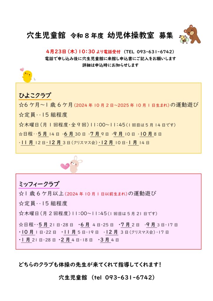 穴生児童館 令和8年度 親子体操教室募集のお知らせ2026.04.09