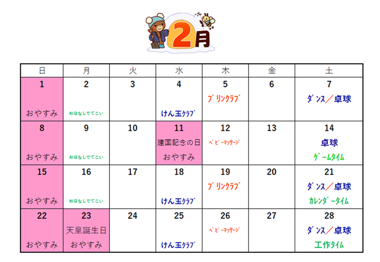 2月の深町児童館の予定は以下の通りです。