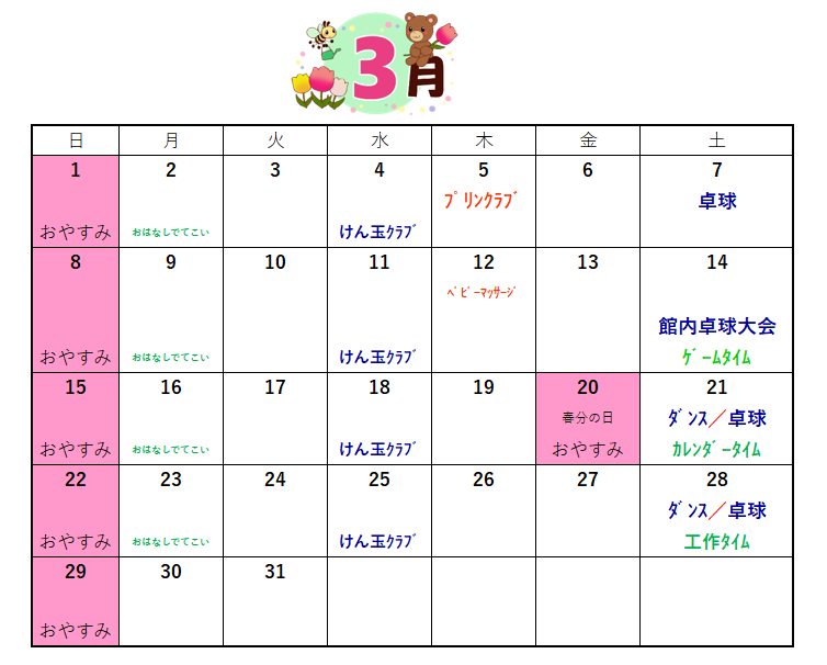 3月の深町児童館の予定は以下の通りです。