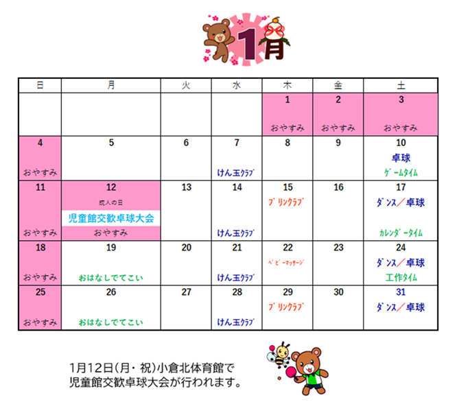 1月の深町児童館の予定は以下の通りです。