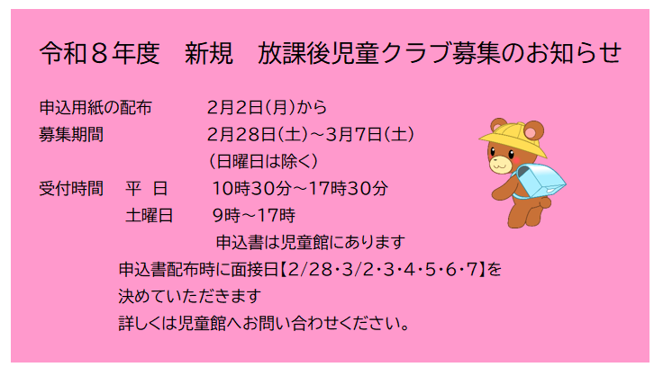 午前9時~午後5時(放課後児童クラブ:午前8時00分~午後5時※延長あり)