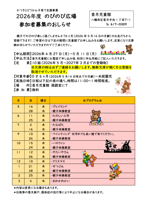 午前9時~午後5時(放課後児童クラブ:午前8時00分~午後5時※延長あり)