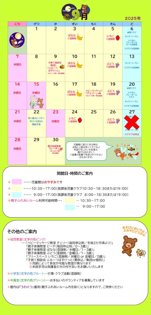 午前9時~午後5時(放課後児童クラブ:午前8時00分~午後5時※延長あり)