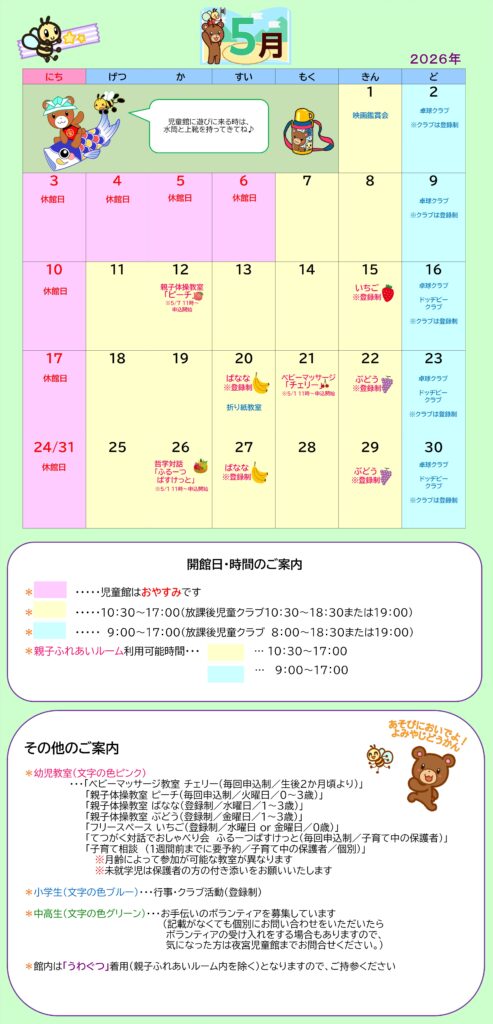 午前9時~午後5時(放課後児童クラブ:午前8時00分~午後5時※延長あり)